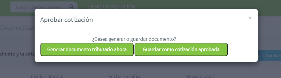 Al aprobar una cotización puedes simplemente aprobar o también generar un documento tributario a partir de ella: