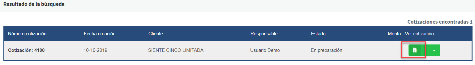 Al ya iniciar la búsqueda de la cotización se aparecerán los resultados asociados al filtro de búsqueda, en la opción de Ver cotización podremos ver el documento a mas detalle: