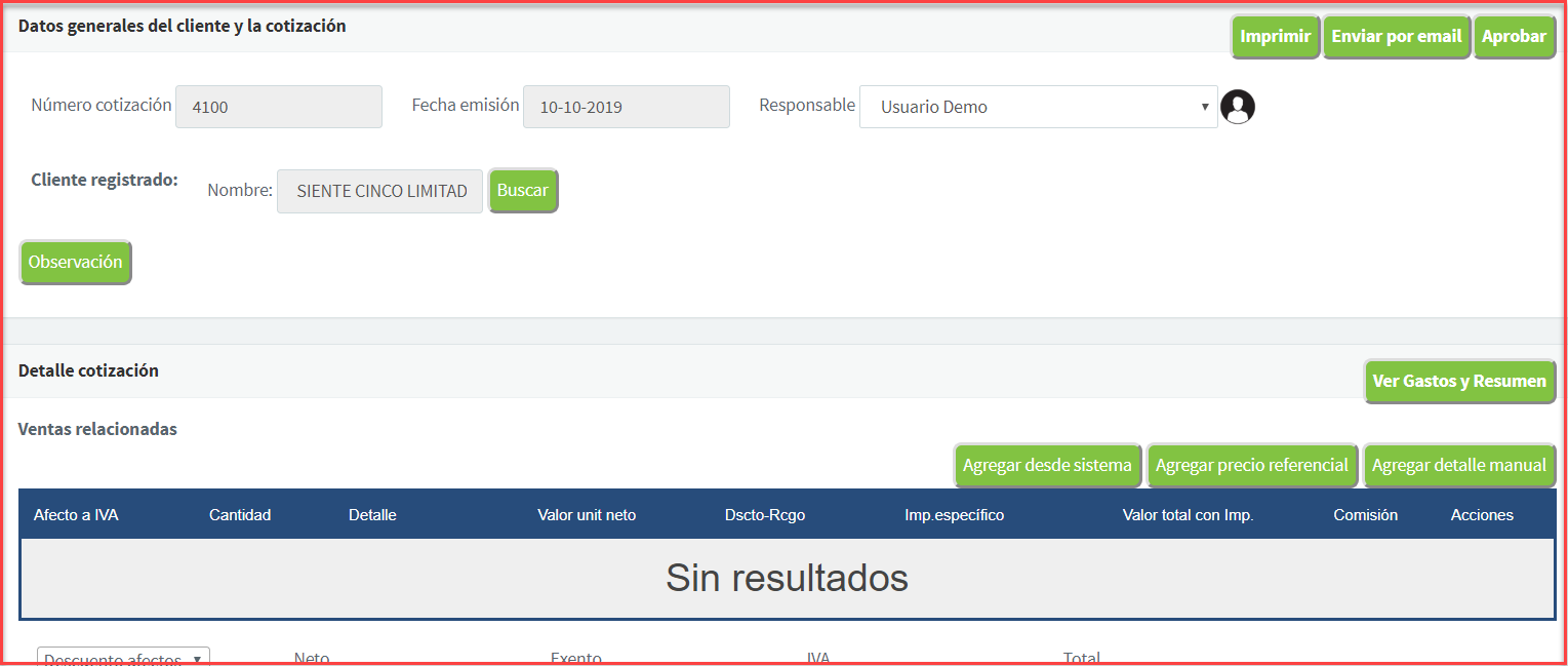 Al usar el botón se nos abrirá el documento con mas detalle, podremos visualizar mejor la cotización, para quien va dirigida, quien es el responsable, la fecha de emisión y el detalle: