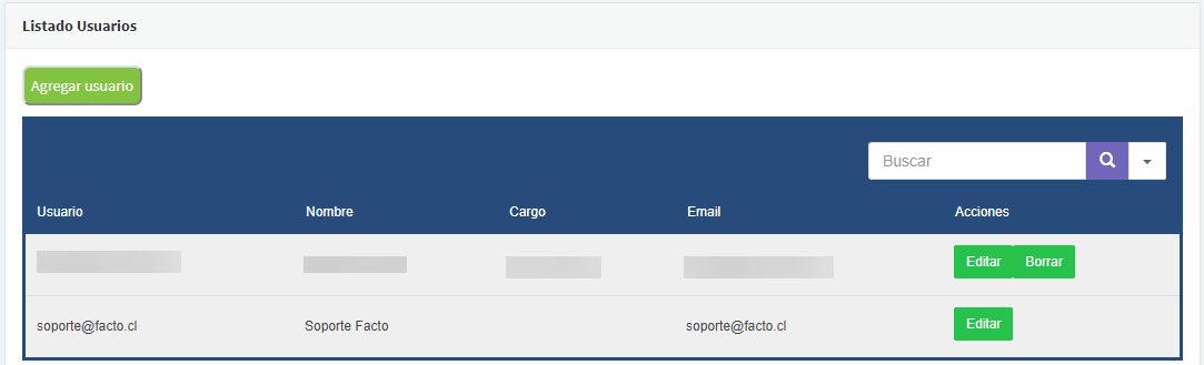 Cuando ya estemos dentro, se nos abrirá una lista de todos los usuarios que tiene acceso al panel de control del administrador, al visualizar esta lista de usuarios creado podemos ir al botón de ''editar'' como se visualizan en la imagen, ahí podemos ver o asignarles los permisos ya sea para facturar, administración, cobranzas, entre otros.