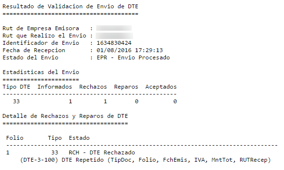 Error en email "(DTE-3-100) DTE Repetido (TipDoc, Folio, FchEmis, IVA, MntTot, RUTRecep)" y documento rechazado