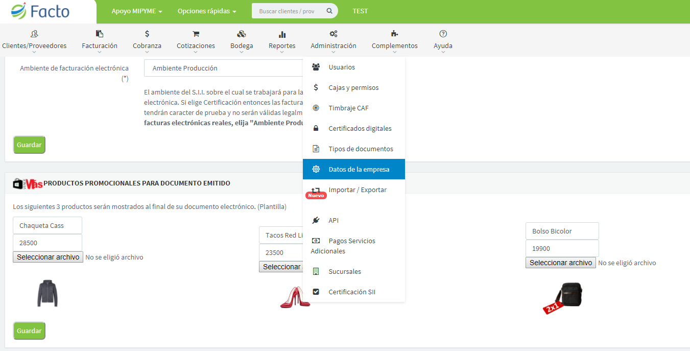 3. Configura un máximo de 3 artículos desde el Módulo de Administración, Datos de la Empresa. En caso de que sólo desees usar el diseño sin agregar ninguno de los productos promocionales, puedes hacerlo, en tal caso aparecería en blanco el espacio para promociones. Cabe mencionar que sólo los usuarios con permisos de administrador pueden configurar la plantilla predeterminada