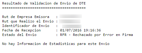 Luego de enviar un documento al S.I.I. se recibe un email indicando rechazo por error en firma, con el texto "No hay información de Estadísticas para este Envío"
