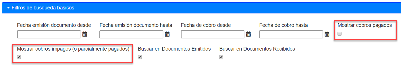 Principalmente existen dos diferencias entre estas opciones, la primera es que los campos de búsqueda en Documentos Impagos solo permiten marcar y desmarcar si corresponde a documentos emitidos o recibidos, además que los campos de fecha solo sirven para fecha de emisión del documento en este caso, por lo que para búsquedas más detalladas, se recomienda utilizar el modulo Cobranza -> Buscar Cobros: