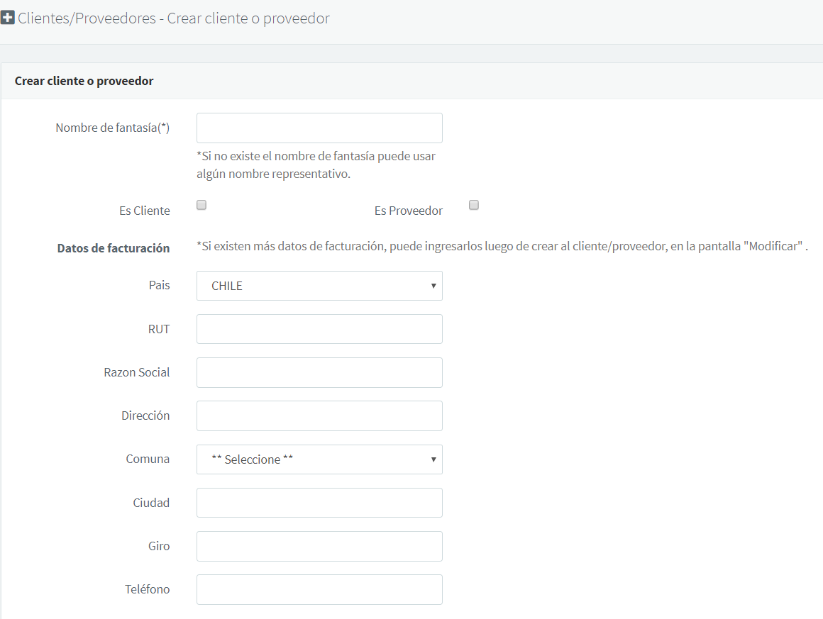 Para registrar se hace por medio del modulo Clientes/Proveedores -> Crear cliente o proveedor.
