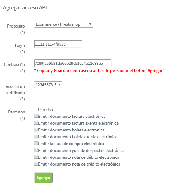 - Contraseña: debe ser copiada y guardada ya que esta solo será visible antes de presionar el botón “Agregar” (esto es obligatorio ya que la contraseña será ocupada nuevamente en otro proceso).