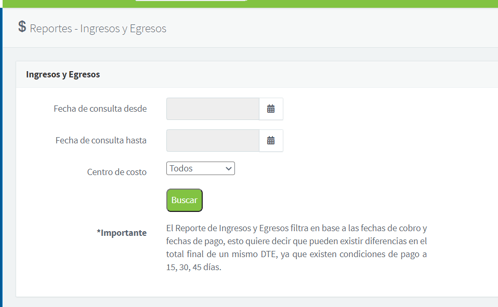 Este reporte nos permite consultar un resumen de ingresos y egresos de todos los documentos registrados en la cuenta de Facto, dentro de cierto rango de fechas, y para la totalidad de la empresa, o para un centro de costo en particular.