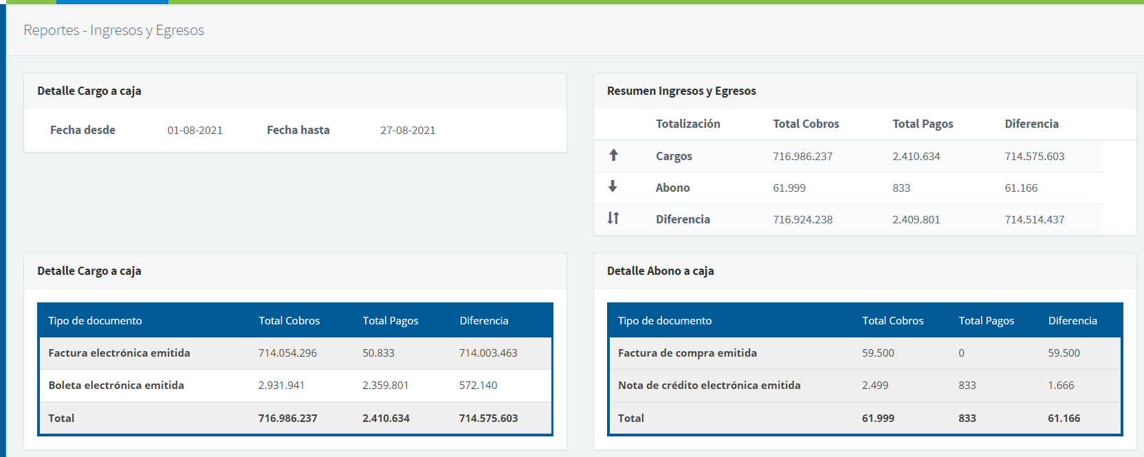 Luego con esto, al presionar el botón "Buscar", se nos mostrará una pantalla con el resumen de cargos y abonos a caja, donde las columnas "Total Cobros", corresponden a los montos totales de los documentos, mientras que las columnas "Total Pagos", corresponden a lo efectivamente pagado, por otro lado los cargos corresponden a dinero que ingresa a la empresa, y los abonos al dinero que sale de la empresa, luego en el recuadro que está arriba a la derecha sale un resumen de todo, donde el número en la fila Diferencia y columna Diferencia correspondería al total que nos pagaron menos lo que hemos pagado nosotros: