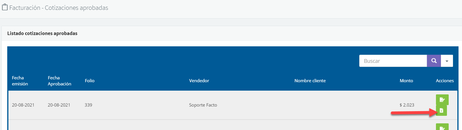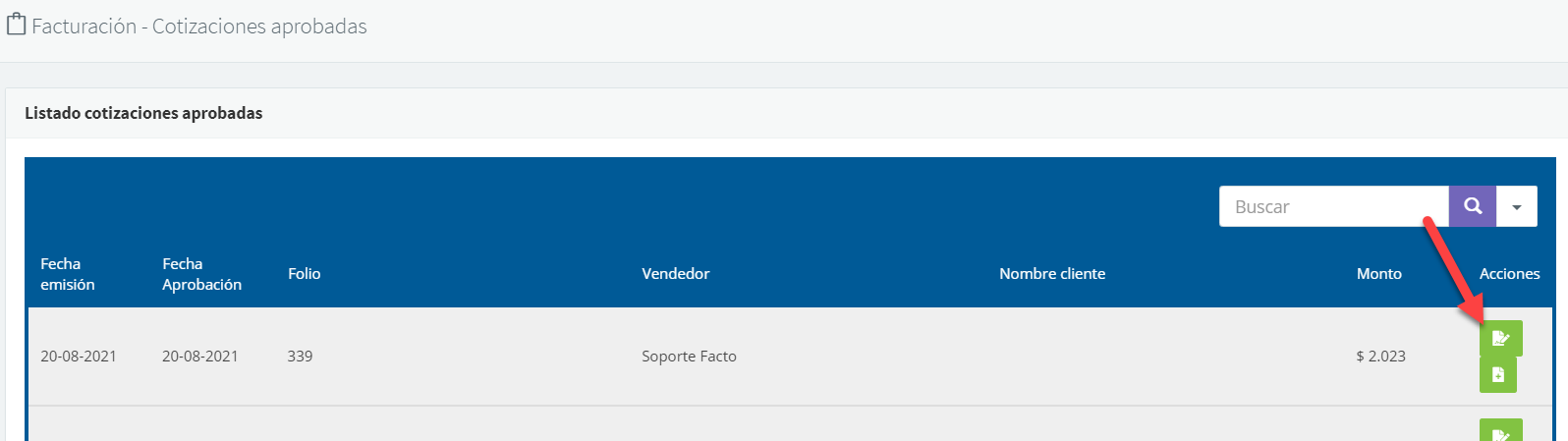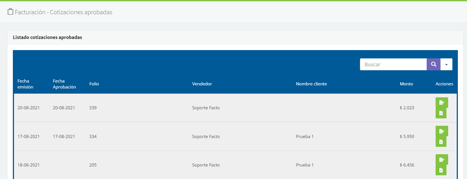 Al ingresar al módulo Facturación >> Cotizaciones aprobadas, se mostrará un listado con todas las cotizaciones aprobadas: