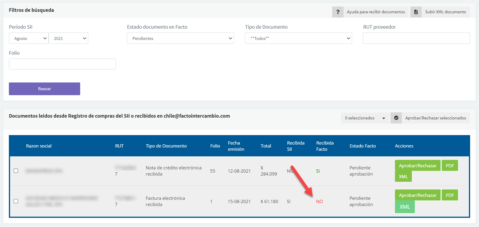 ¿Por qué en los Documentos recibidos aparece NO Recibido en Facto o NO Recibido en SII?