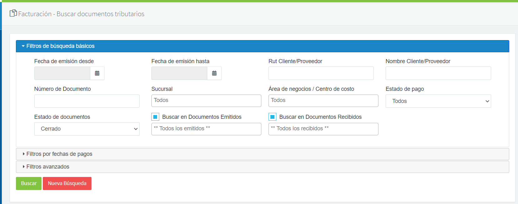 Para marcar pagado un documento ya emitido debes dirigirte al módulo Facturación >> Buscar documentos tributarios, donde podrás buscar el documento correspondiente e ingresar en este para registrar el pago, podrás ubicar el documento gracias a los diferentes filtros de búsqueda: