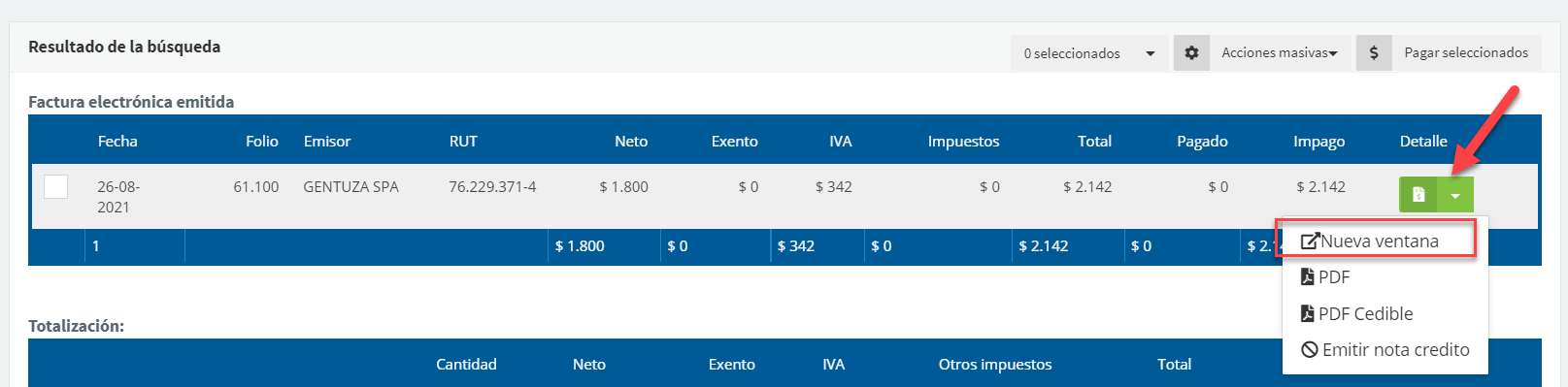Habiendo ingresado al documento, haces click en la opción Pagos, podrás visualizar el monto impago del documento, para pagar deberás hacer click en el botón Pagar: