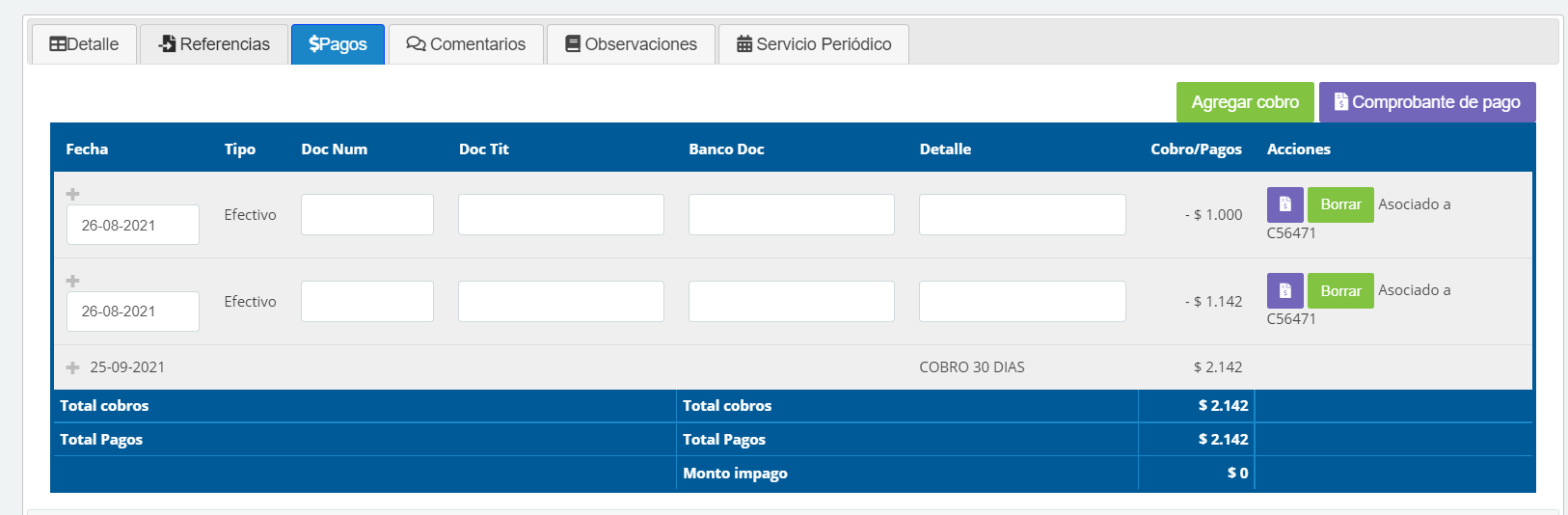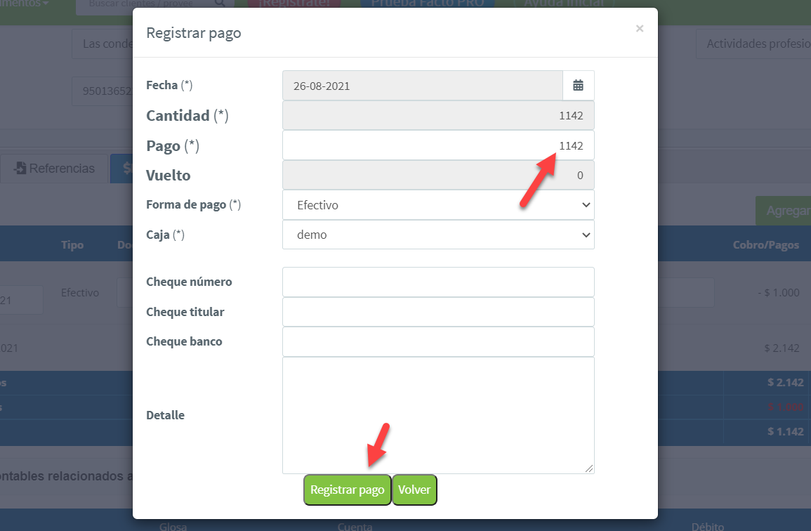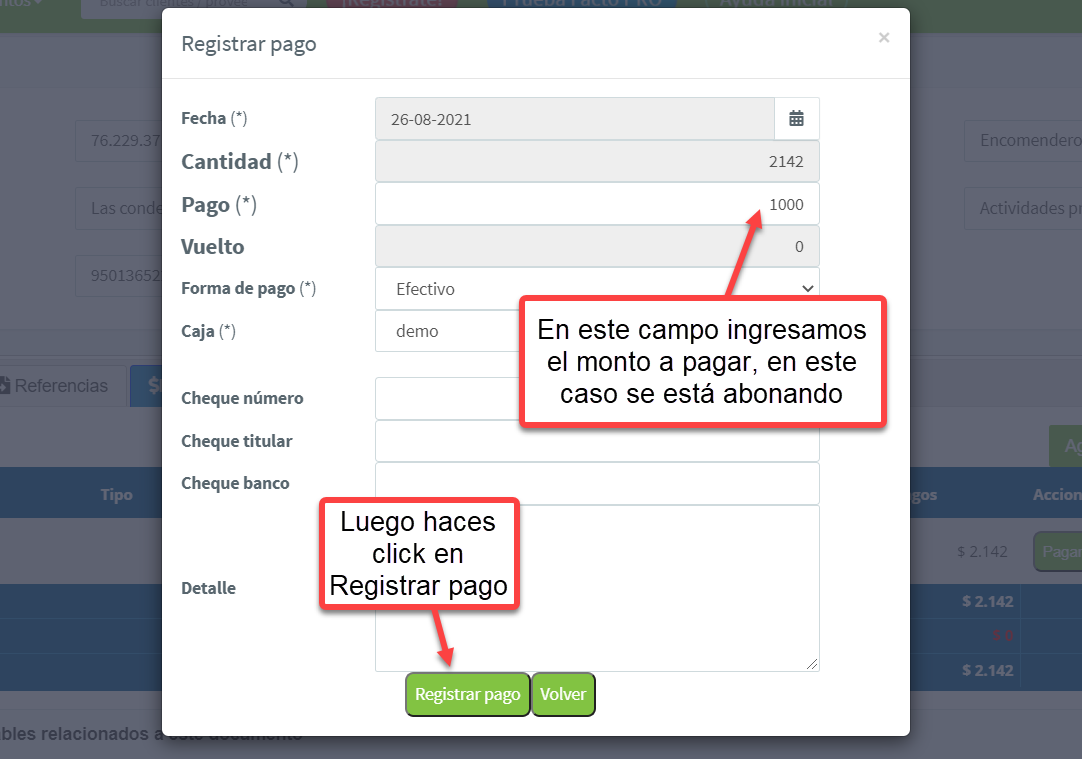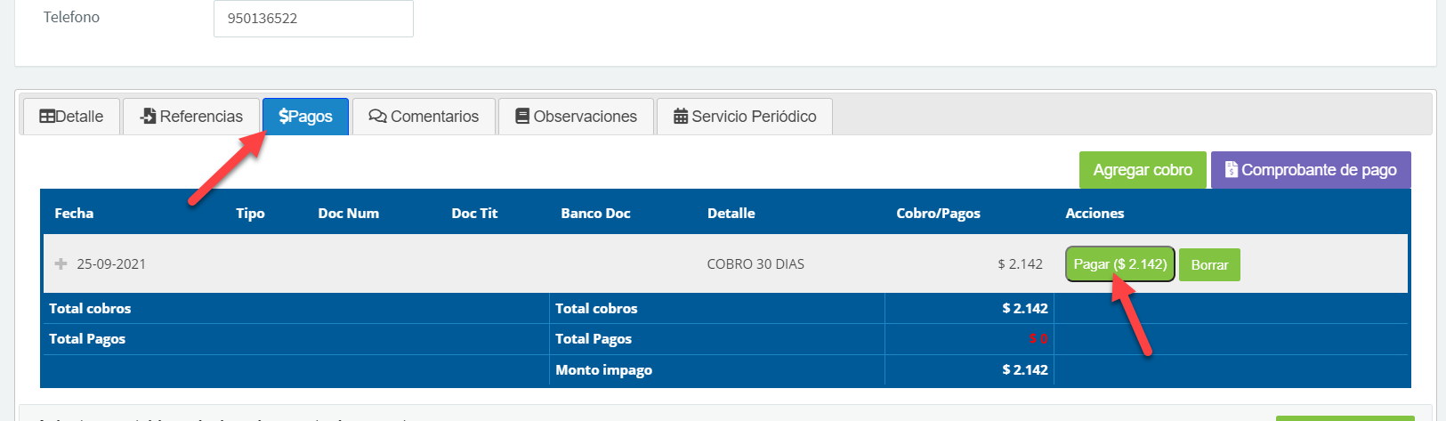 Al abonar se registrará el pago y en el botón "Pagar" aparecerá diferencia del total: